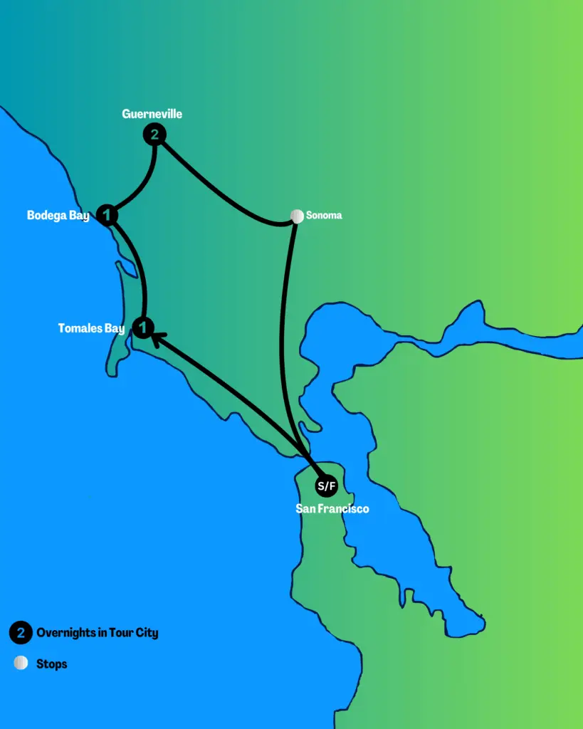 Continue north to Tomales Bay Resort and settle into your room before heading out to a cosy Inverness restaurant for dinner (own arrangement). Later, experience something truly magical – a bioluminescent kayak tour under the stars, where the water glows with every paddle stroke.